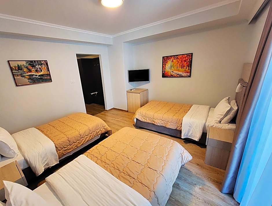 The triple room offers air conditioning, a wardrobe, as well as a private bathroom featuring a walk-in shower and a bath. The triple room features a flat-screen TV with cable channels, a safe deposit box, parquet floors, a carpeted floor as well as city views. The unit offers 3 beds.