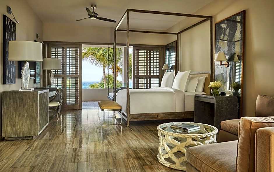 This room features a custom-designed bed and a marble bathroom appointed with double sinks, a deep soaking tub and an oversize walk-in shower. Watch the Caribbean sun on the spacious outdoor sundeck with chaise lounges for two.
