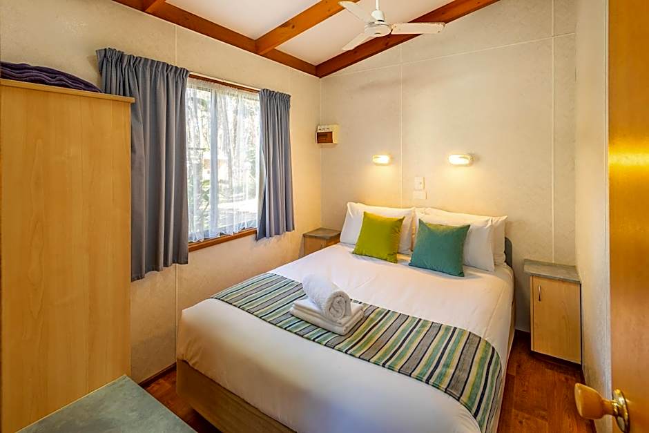 New in 2015, these bamboo bungalows offer 2 bedroom with a queen in the main bedroom and 2 sets of bunk beds in the second bedroom. All linen is provided. They have a bathroom, full kitchen, lounge with TV/DVD, dining table, air-conditioning and furnished deck with car parking alongside.