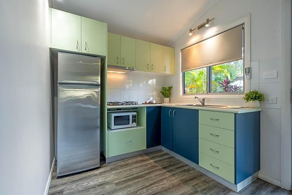 The "Bathing Boxes" are a fun alternative to camping. This studio offers a ceiling fan, toaster, small refrigerator, TV and tea/coffee making facilities. It offers access to communal bathroom facilities and camp kitchens. Linen is supplied in a bundle ready for guests to make their own beds. Towels are supplied.