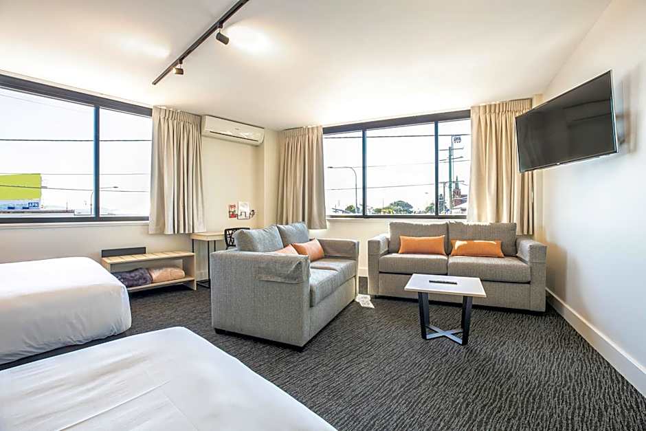 Accommodations come in a range of layouts to fit different travel needs. Options include Studio Economy, Studio Queen/Twin, Studio with Queen Bed, Studio Queen & Single, and Compact Studio, Queen, with additional Family Studio choices for a bit more space. For larger groups or longer stays, Apartment configurations are available, including an Apartment, 2 Bedroom at up to 861 square feet with multiple beds, plus other apartment setups.