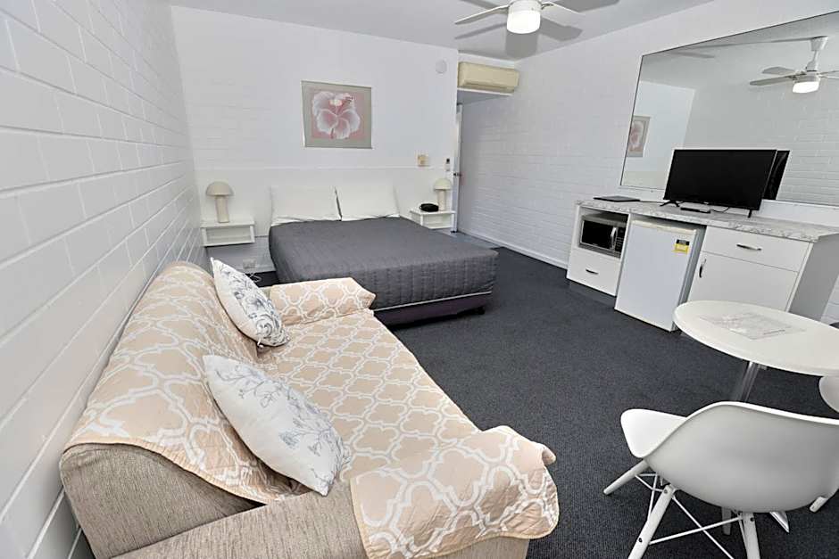 This spacious studio room has one queen bed and one single bed, private bathroom, tea and coffee making facilities, LCD TV and ample bench space.