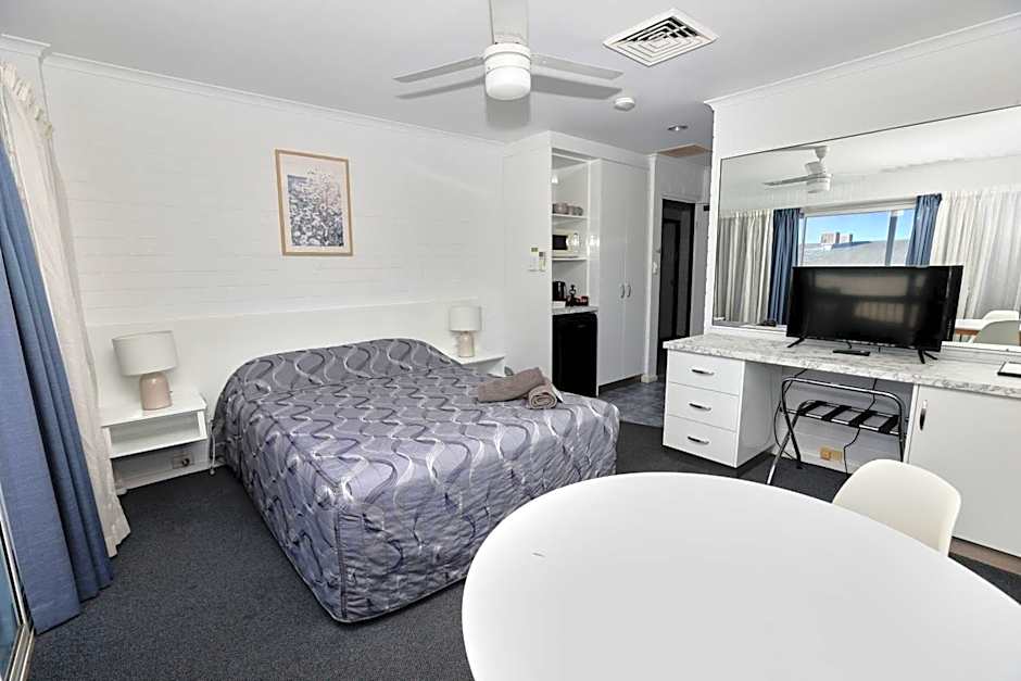 This spacious studio room has a queen bed, balcony, private bathroom and tea and coffee making facilities.