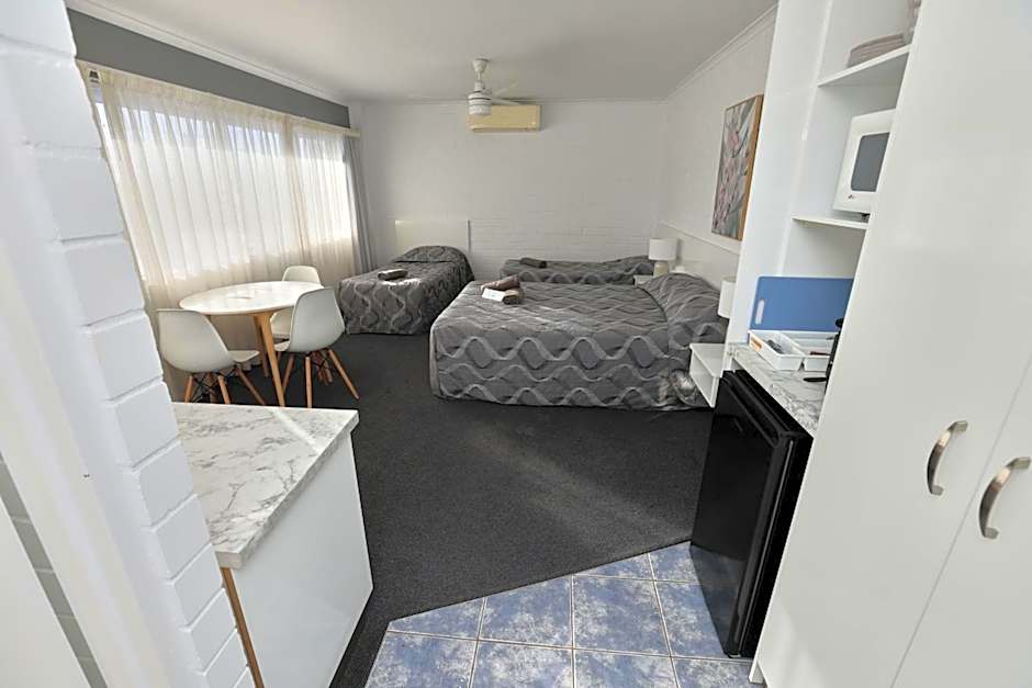 This studio room has 1 queen bed and 2 single beds, a private bathroom, tea and coffee making facilities, LCD TV and ample bench space.