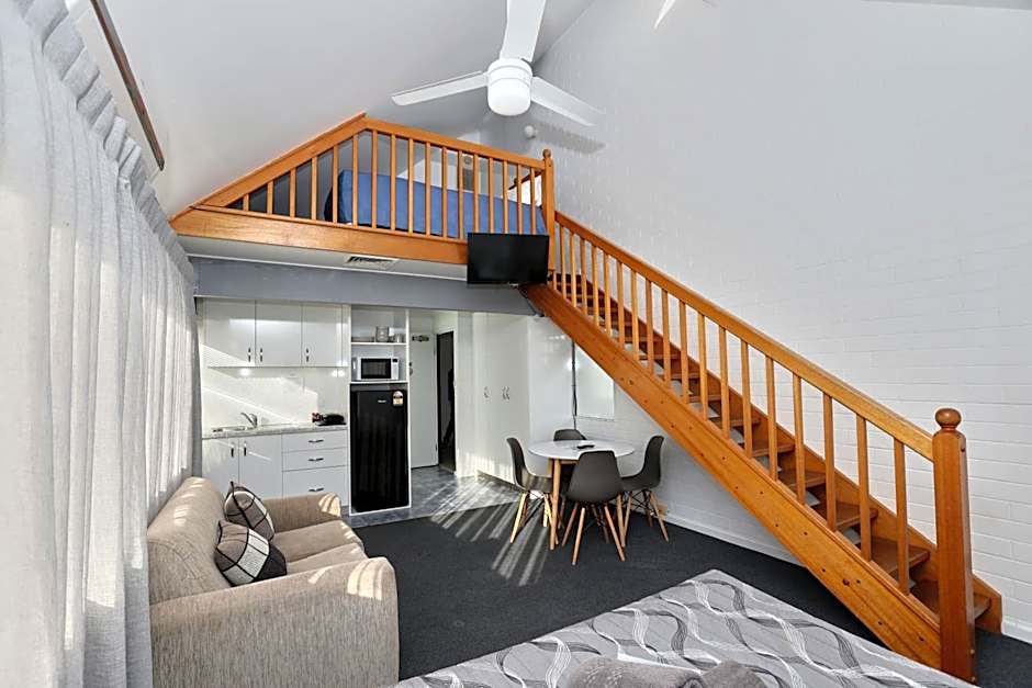 Spacious self-contained unit with queen bed, kitchen and private bathroom in the main area and two single beds on a mezzanine floor. The kitchen is equipped with a fridge, sink, microwave, hot plates, griller and cooking utensils.