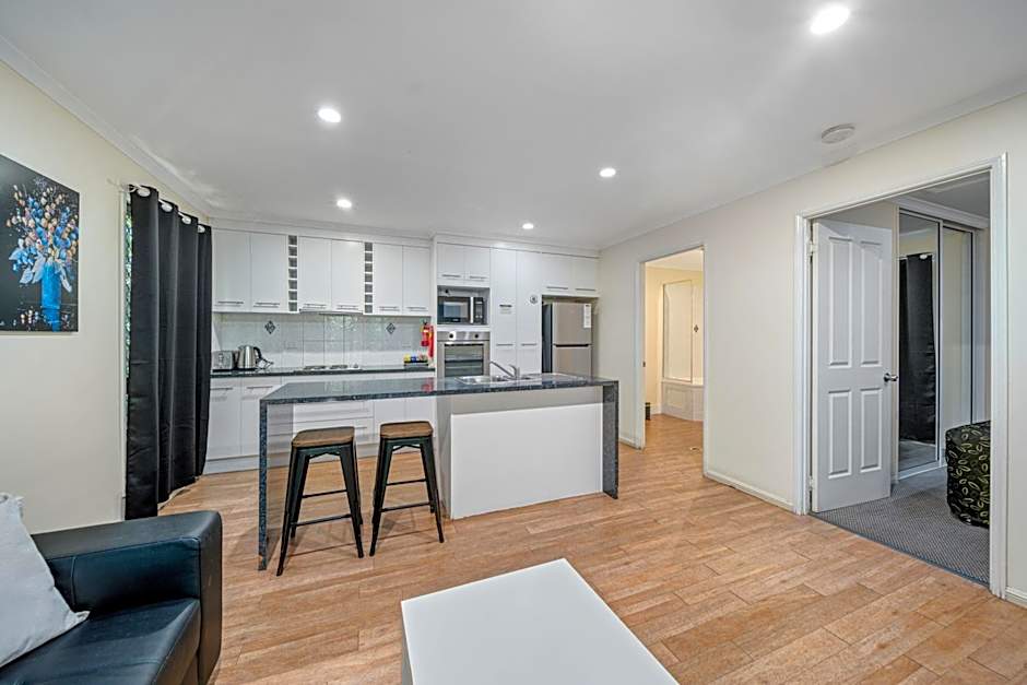 This apartment includes a Queen bed in a private room, a single bed and a trundle bed in the open plan living area. Full laundry, kitchen facilities and spa bath are also included.