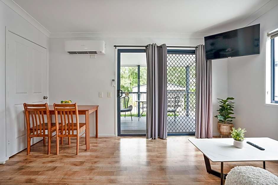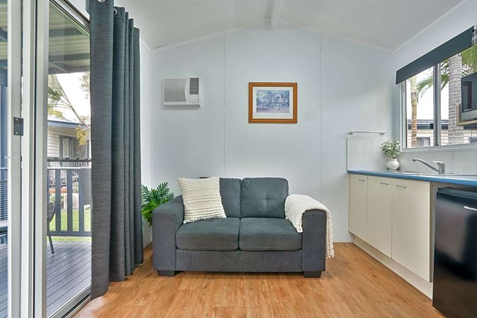This Deluxe cabin is located close to facilities including the amenities block, laundry, pool and barbecue area. It features air-conditioning, kitchen with stovetop, oven, microwave and fridge and a dining area. Also included is a bathroom, veranda with outdoor furniture and sofa and seating area with TV.