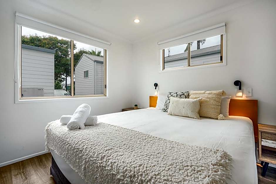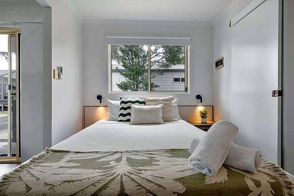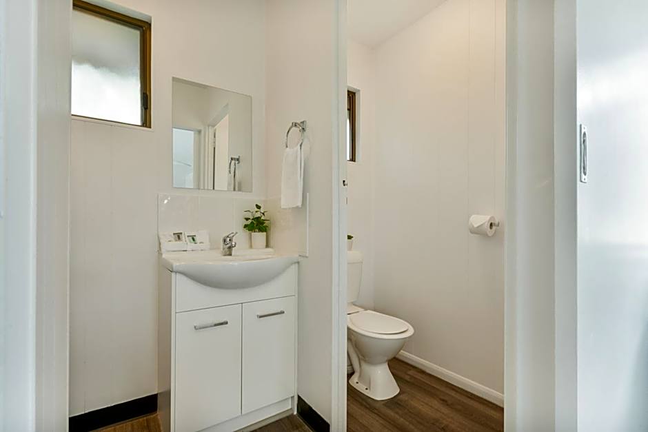 Open-plan bungalow with air conditioning, ceiling fan, flat-screen TV and an private bathroom. The full kitchen includes a fridge/freezer, stove and microwave. Linen is supplied, free of charge.