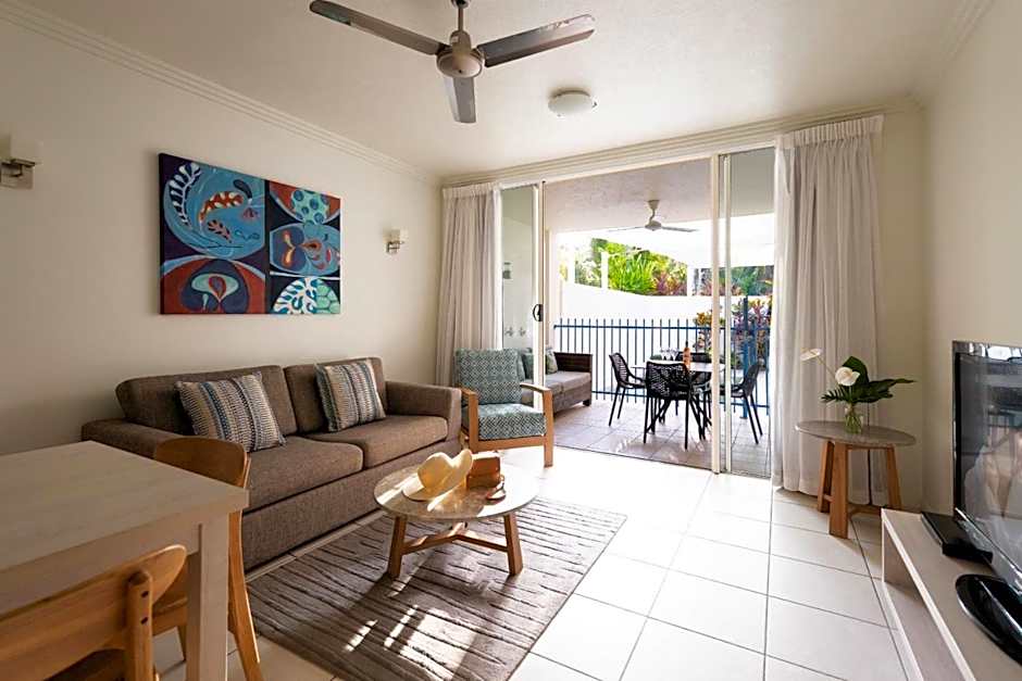 This air-conditioned apartment features direct access to the lagoon-style swimming pool from its private balcony. It also includes full kitchen and laundry facilities, interconnecting rooms and a spacious living room.