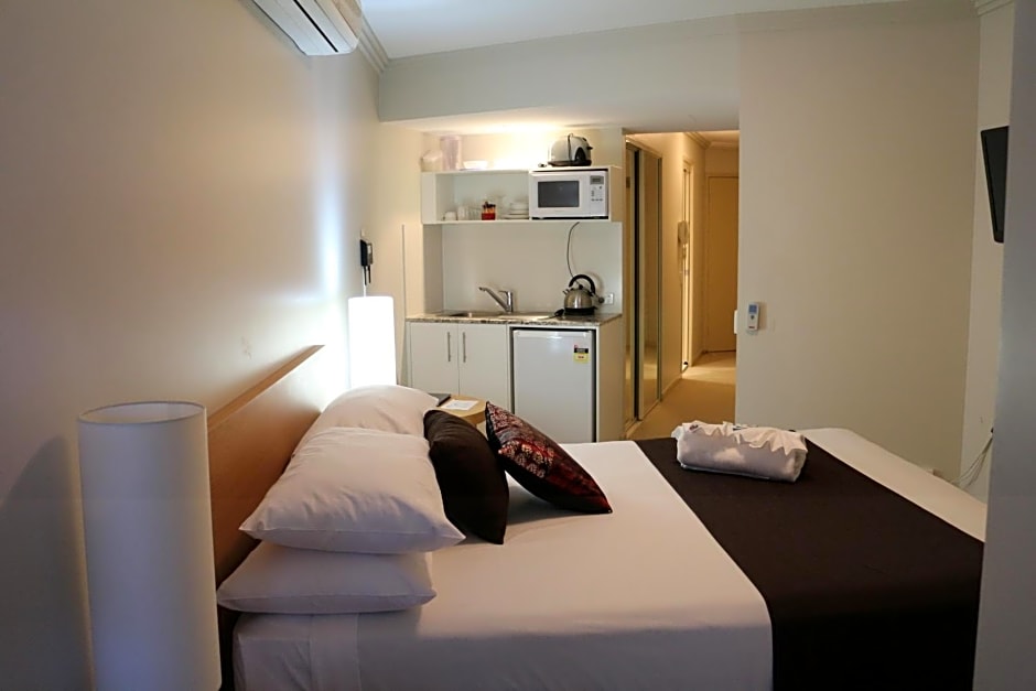 The large one-bedroom apartments have a separate kitchen, bathroom, laundry and main bedroom with a large balcony which can be accessed from both the lounge room and main bedroom. The separate interconnecting motel room, although with no balcony, is comfortable and includes a modern bathroom and walk in wardrobe. There is an under-bench fridge, microwave, tea/coffee making facilities, free internet, cable channels and secure parking. The unit is partially air conditioned. Please note that all apartments are individually furnished and the photos are presented as a guide only.