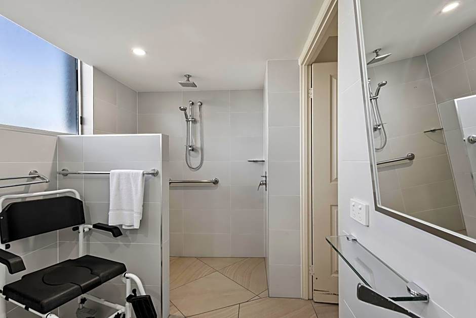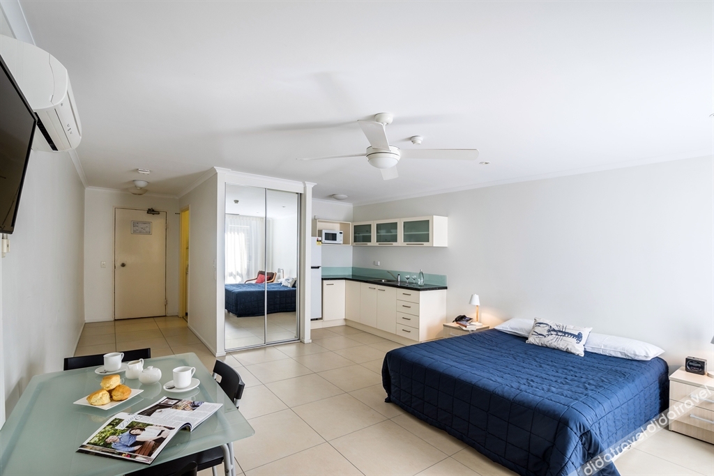 This is a standard Motel room on the Ground floor convenient for Overnight stays. Motel rooms do not have a view. For longer stays we offer our spacious fully self-contained holiday apartments in the high-rise section of the property. Motel room includes a kitchenette, laundry facilities, private bathroom and air conditioning only a minutes' walk from Mooloolaba Beach.