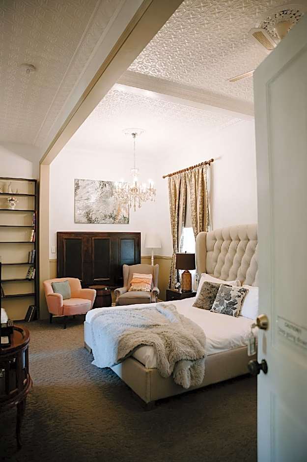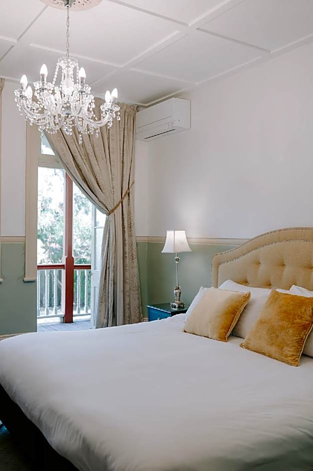 This renovated room features a Queen bed and an private bathroom with a separate shower and bath. There is a private veranda, a TV and DVD player, with 600 DVDs available from the front desk. There is a dressing room with a wardrobe and a dressing table, and pressed metal ceilings. Tea and coffee making facilities are provided.