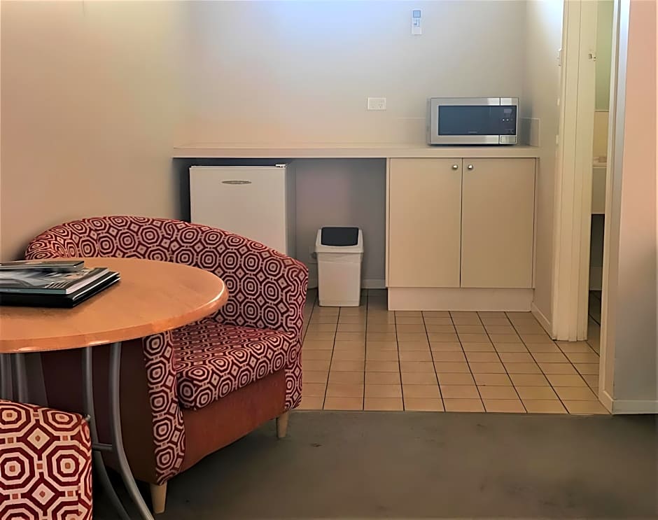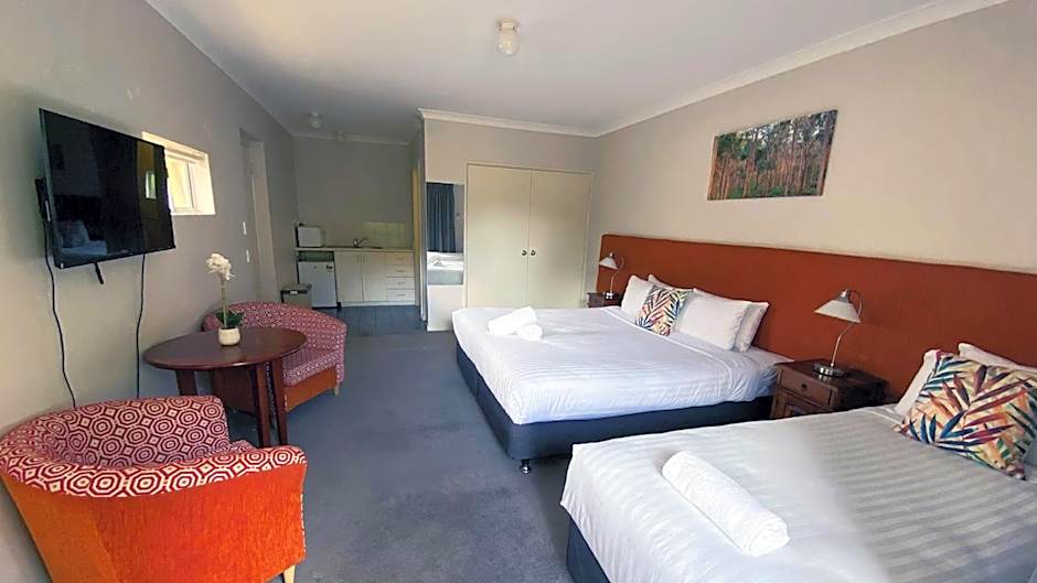 This room a king bed, a partitioned wall and asingle bed There is a sofa, private bathroom, reverse cycle air conditioning, TV, bar fridge, microwave, toaster, kettle and free on-site parking.