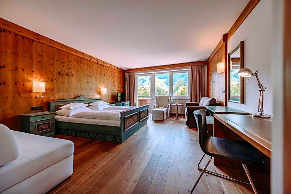 The Gartenhotel Theresia 4-Sterne Superior offers a variety of room types with different occupancy capacities, bed sizes, and room sizes. There are suites such as the Two-Bedroom Suite, Junior Suite with Mountain View, and Junior Suite with Balcony, accommodating 2-4 adults with king size beds. Other options include the Double Room with Balcony, Double or Twin Room with Mountain View, Budget Double Room, and Triple Room with Garden View, all accommodating 2 adults with king or queen size beds. There are also family-oriented rooms such as the Economy Quadruple Room, Two-Bedroom Suite with multiple bed options, and the Family Room, accommodating 3-4 adults with various bed combinations.