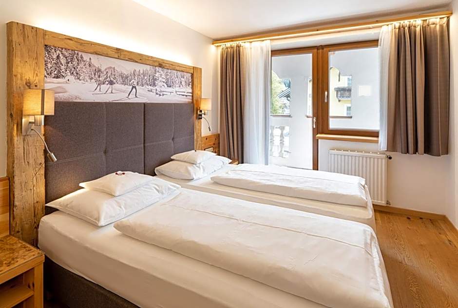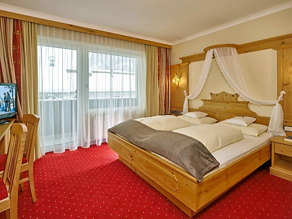 Very spacious room in a modern Tyrolean country style, with a balcony overlooking the garden and the mountains, a living area with a mini-bar and satellite TV, and a bathroom with bathrobes, toiletries, and a hairdryer. The junior suite features either a four-poster bed or a Swiss pine bed and furniture. Some of the rooms were refurbished in 2016.