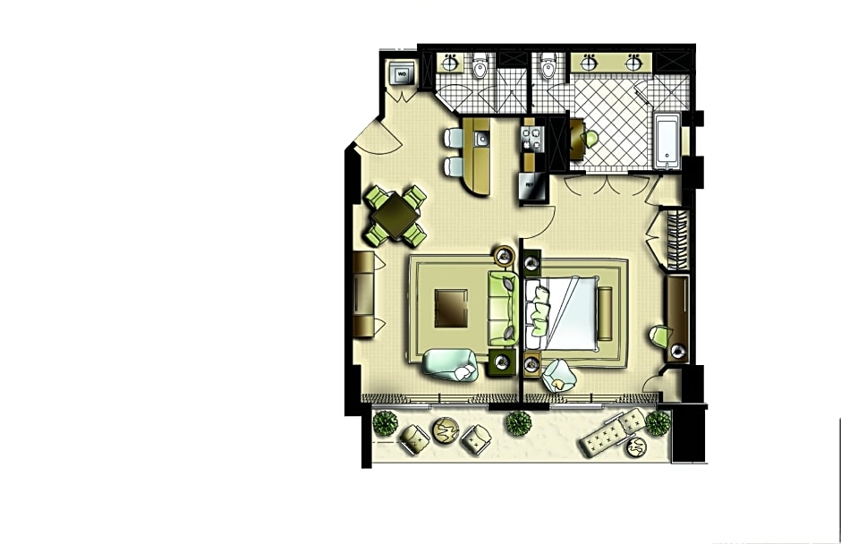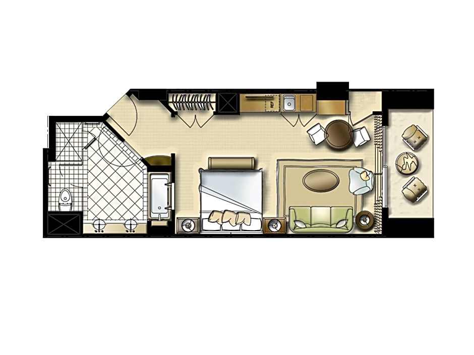 Located on floors 1-4 and just steps away from the white-sand beach and crystal-clear Caribbean, this spacious Studio offers a 1 King Bed and a Queen Sleeper Sofa. Enjoy a fully equipped Kitchenette, a table with 2 chairs, a large master bath with twin basins, and deluxe amenities. Relax on your private balcony or terrace overlooking the tropical Atlantis landscape. • Kitchenette • Mini-fridge • 2 Burner Cooktop • Toaster and Blender • Coffeemaker • Dishwasher • Cookware • Flat-ware and Glassware • Flat Screen HDTV • Individually Controlled A/C • Bath Amenities • Iron and Full-Size Ironing Board • Hairdryer • Bathroom Scale • Alarm Clock • Laptop-size in-room Safe • Premium Wi-Fi • In-Room Dining • Size: 523 sq. ft. • Views: Resort/Garden • Max Occupancy: 3 Guests and 1 Child under 4