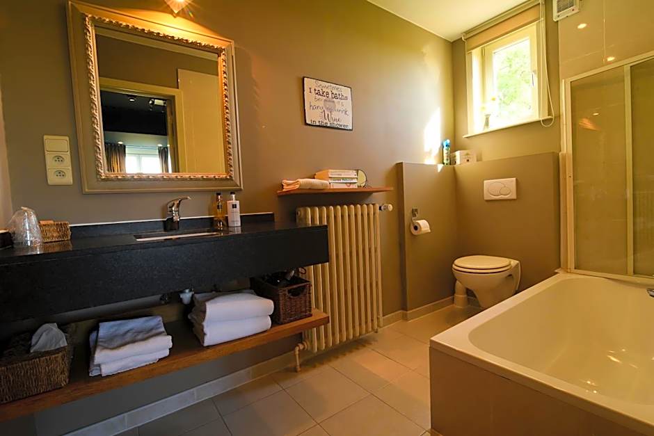 Suite with a king-size bed. Stunning view over the polders and meadows. Luxurious bathroom with double sink, bathtub, and walk-in shower,