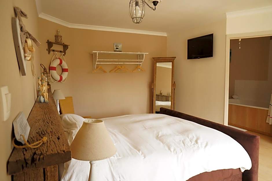 This sea-side themed room includes a box-spring bed, a flat-screen LED TV and a private bathroom with a bath, shower, sink and a toilet.