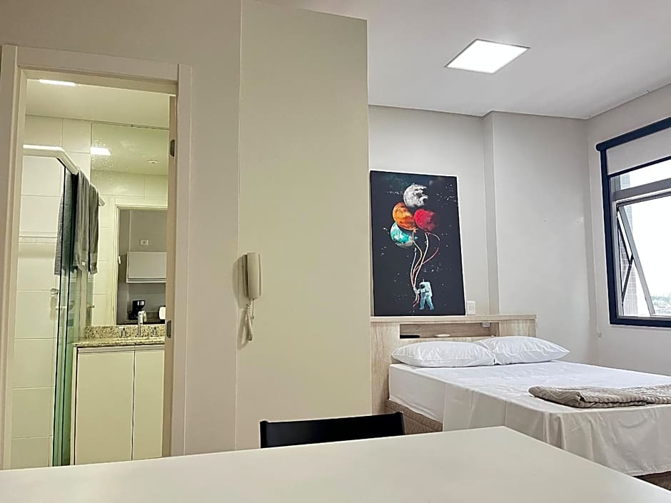 Para quem viaja com animais de estimação, a opção Pet Friendly está disponível mediante cobrança adicional. A área externa abriga a piscina, e há playground para crianças — ideal para famílias que gostam de ter opções de lazer por perto. O espaço ainda oferece cozinha para preparo de refeições, itens de higiene gratuitos e uma recepção 24 horas para check-in a qualquer hora.