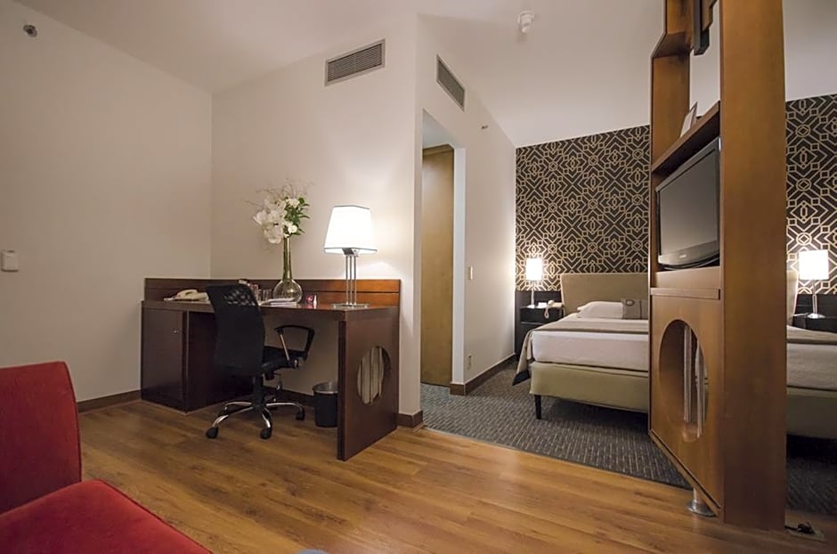 This suite with wood flooring has 3 rooms: a bedroom with Queen Size bed, an office with desk and two chairs and a living room with sofa and pouffe. All suites have balcony overlooking the city, air-conditioning, mini-bar with complimentary water and safe deposit box. They also feature 2 LCD TVs 26” with cable channels, bathrobe and slippers for indoor use and wireless direct dial phone. The bathrooms are fitted with shower, hairdryer and courtesy toiletries.