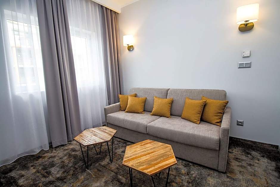 A Suite with two separate bedrooms and a lounge area. This 217 ft² suite has 2 bedrooms with queen size bed, a living room, a fully equipped mini-bar, toiletries by Geneva Guild, rain shower, 3 LED TVs with more than 50 international channels, high speed WiFi, free safety deposit box, central air conditioning, 2 bathrooms, and 2 balconies.