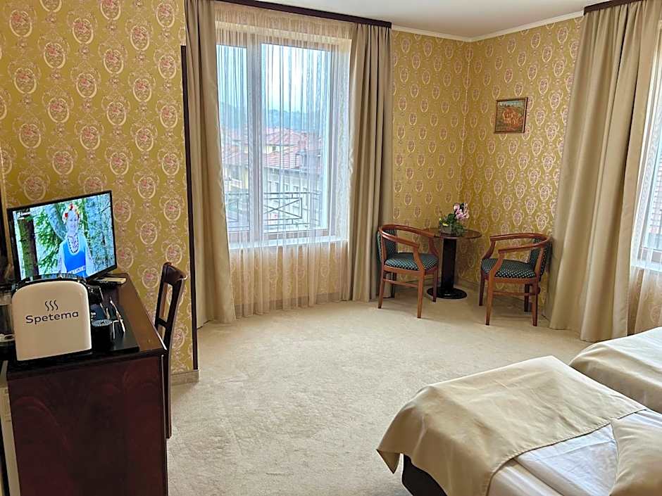 The Chateau Montagne Hotel Troyan offers a variety of room types including Single Rooms, Suites, and Double or Twin Rooms. Smoking is not allowed in any of these rooms. Single Rooms accommodate one adult and have a Queen size bed. Suites can accommodate two adults and two children, with one sofa bed and two twin beds. Double or Twin Rooms can accommodate two adults with two twin beds or one Queen size bed.