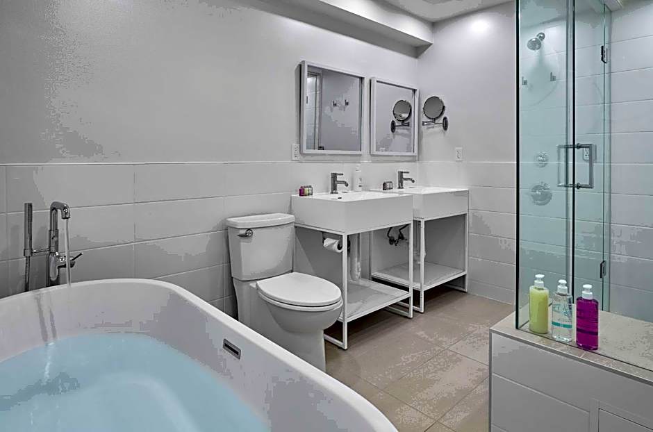Located on the 2nd & 3rd floor, this room includes a separate bedroom, plus a sitting area with pullout couch and gas fireplace. The bathroom has a rainfall shower, soaker tub, bathrobes and extra amenities. This rooms includes free WiFi, a 42" flat-screen TV and an in room safe. A mini refrigerator, microwave and complimentary in-room Starbucks coffee are provided.