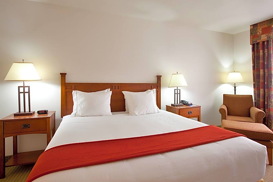 Located in the River Mill Building, this spacious king room includes a whirlpool bath and large window overlooking either the Maitland River or Gledhill Pond. It provides a Keurig coffee maker and bar fridge.