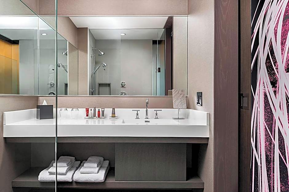 This guestroom features innovative features such as online check in and key-less entry. The room has floor-to-ceiling windows and a city view. Business travelers will enjoy the convenience of free WiFi and an in-room desk. Additional amenities include a 55" flat-screen TV and beside power station. The modern guest bathroom contains a glass-paneled standup shower.
