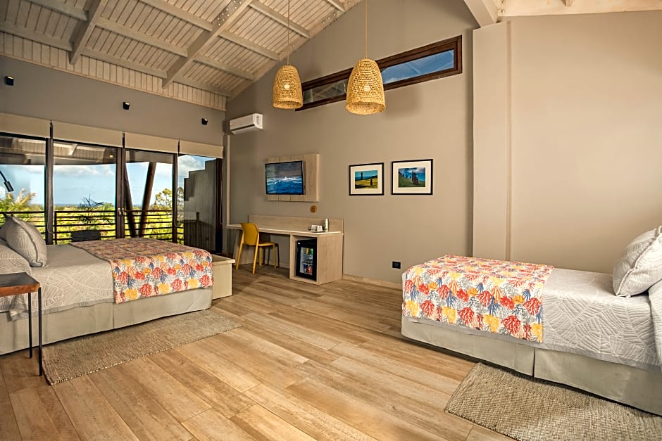 Room configurations range from King Room with Garden View to Triple Room with Sea View, as well as Suites with Sea View and larger layouts like Deluxe and Suite Ariki for bigger groups. Deluxe can accommodate up to 10 adults and 6 children, while Suite Ariki fits up to 8 adults and 5 children, offering options for couples, families, and groups alike.