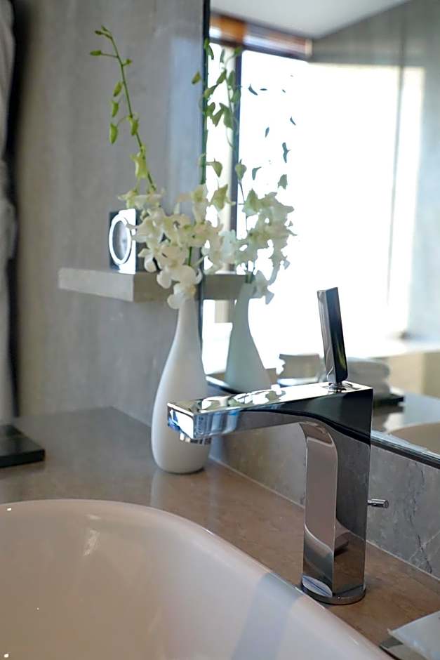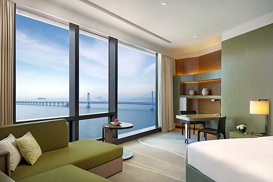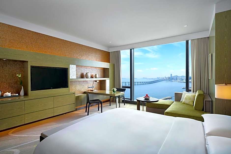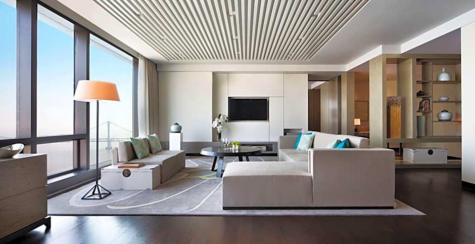 Designed with natural textures and sea inspiration, spacious suite features a seperate livnig room and ocean views through floor-to-ceiling windows. It has a kettle and bottled water in room. The marble bathroom is fitted with an electronic toilet, rain shower and full-size bathtub. Access to the Club Lounge is included.