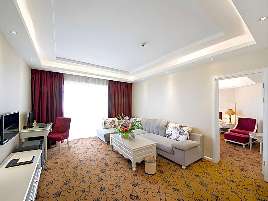Room options span a range from Executive and Deluxe twins to larger suites, with sizes including 377–485 sqft for standard options, 754 sqft for a Suite, and 808 sqft for a Business Suite. Note: Only cash is accepted.