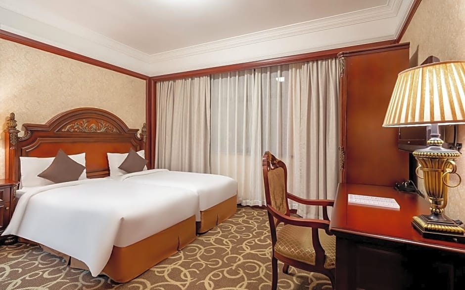 The hotel offers a variety of double rooms including the Grand Twin, Luxury Suite, Deluxe Queen, Business Suite, and Executive Suite. These rooms can accommodate 2 adults and 1 child, have king or twin beds, and do not allow smoking. Room sizes range from 388 to 635 sqft.