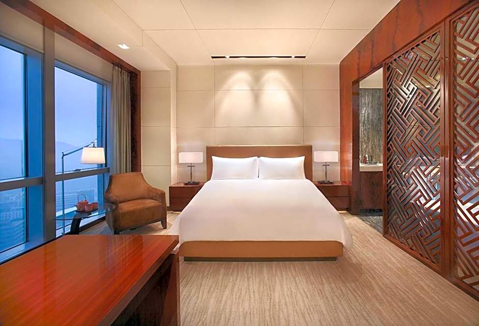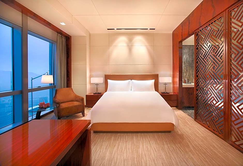 Room is 60 square yards and comes with floor-to-ceiling windows, mini-bar, safety deposit box and a bathtub. Shenzhen city view or Hong Kong mountain view can be enjoyed.