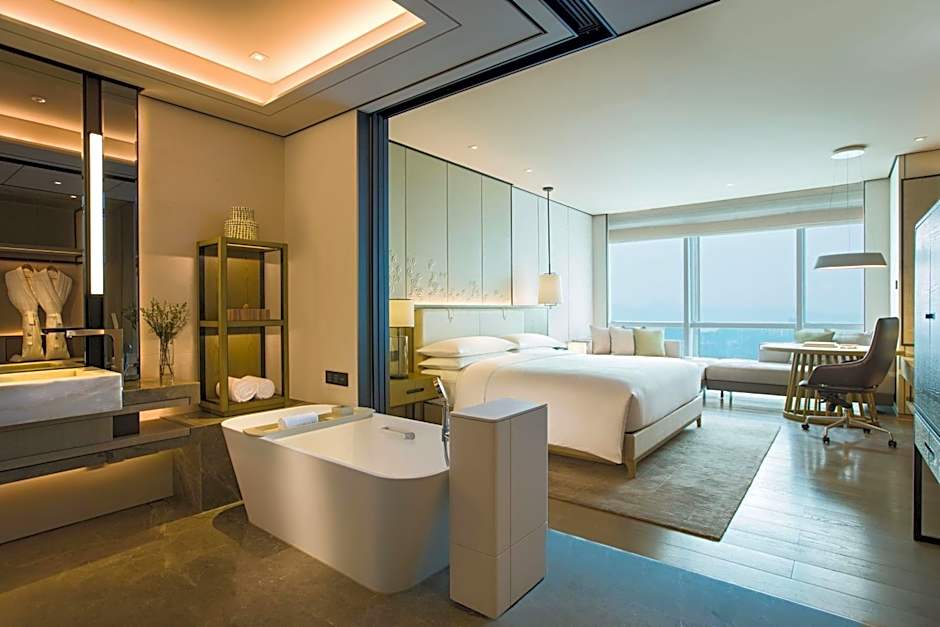 Designed in a chic and modern style, this room offers breathtaking views of Shenzhen city and Hong Kong border. It includes an iPod docking station with alarm clock and radio functions, mirror TV, spa music, mini-bar and a 48-inch TV.