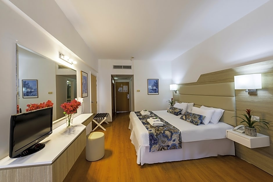 Rooms at the Ascos Coral Beach Hotel include standard rooms, deluxe rooms, and suites. Occupancy ranges from single to quadruple occupancy. Some rooms offer smoking and non-smoking options, while others do not allow smoking. Beds range from single to king-size, with various room sizes available to accommodate different preferences and group sizes.