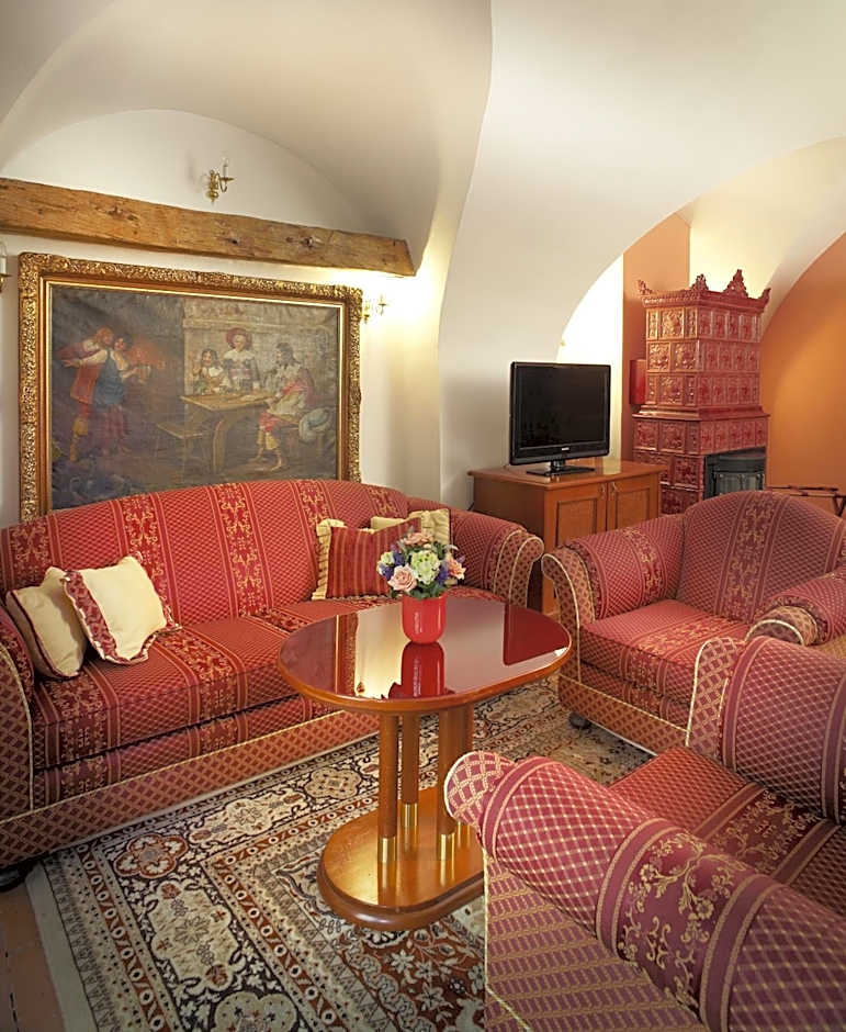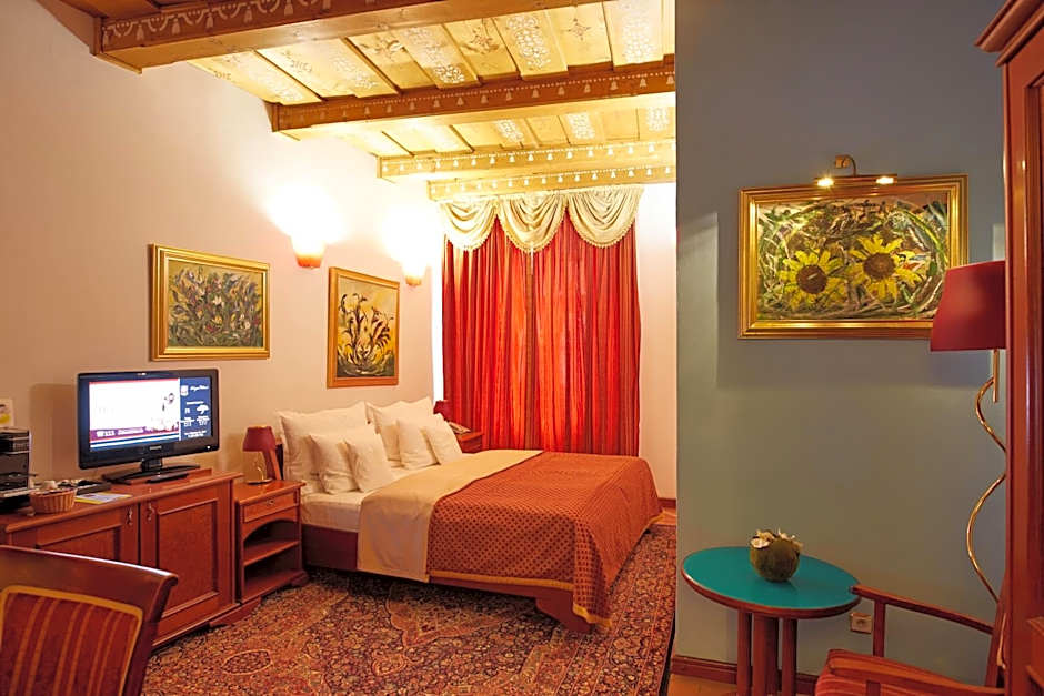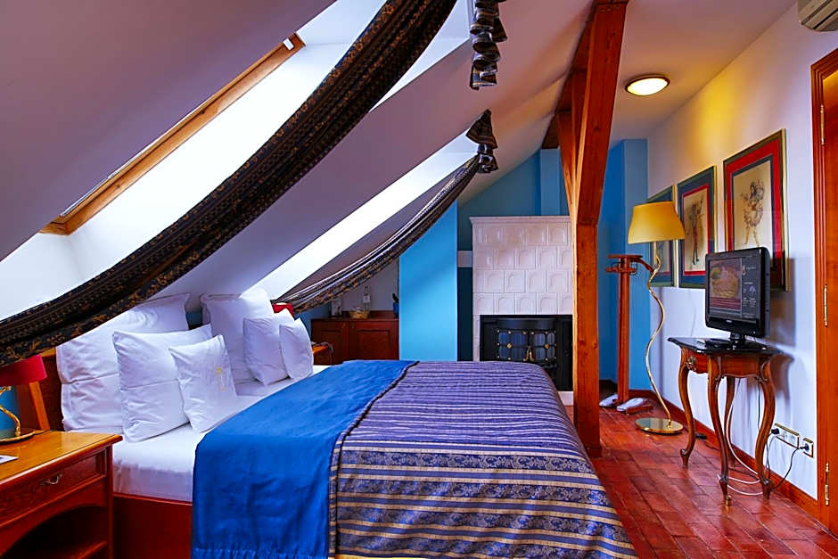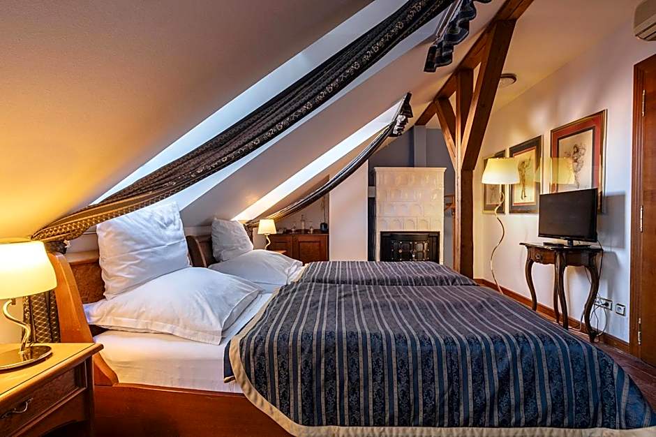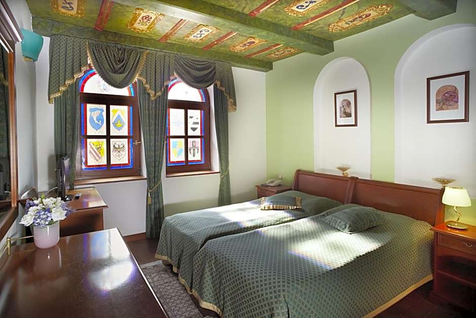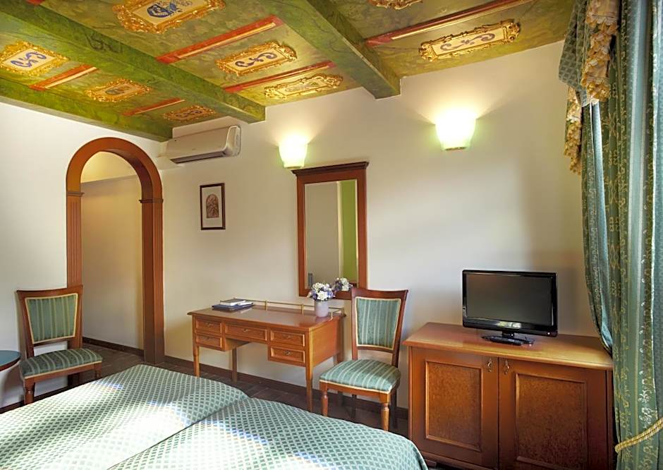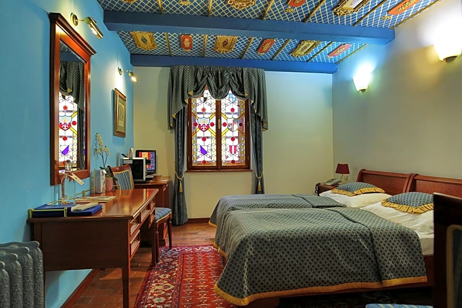 Air-conditioned room with a tiled stove, a wooden coffered ceiling and stained-glass windows. Amenities include a mini-bar, free Wi-Fi, slippers, bathrobes, hairdryer, free toiletries and a bidet in the bathroom.