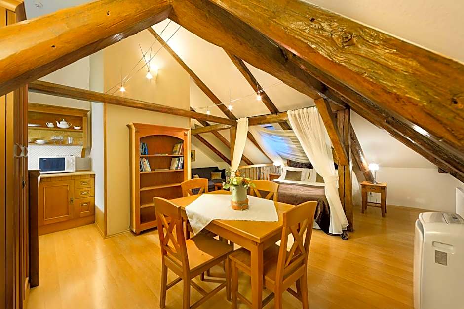 Spectacular studio apartment with an excellent castle view and a romantic, canopy double bed. It has exposed wooden beams in its high cathedral ceilings.