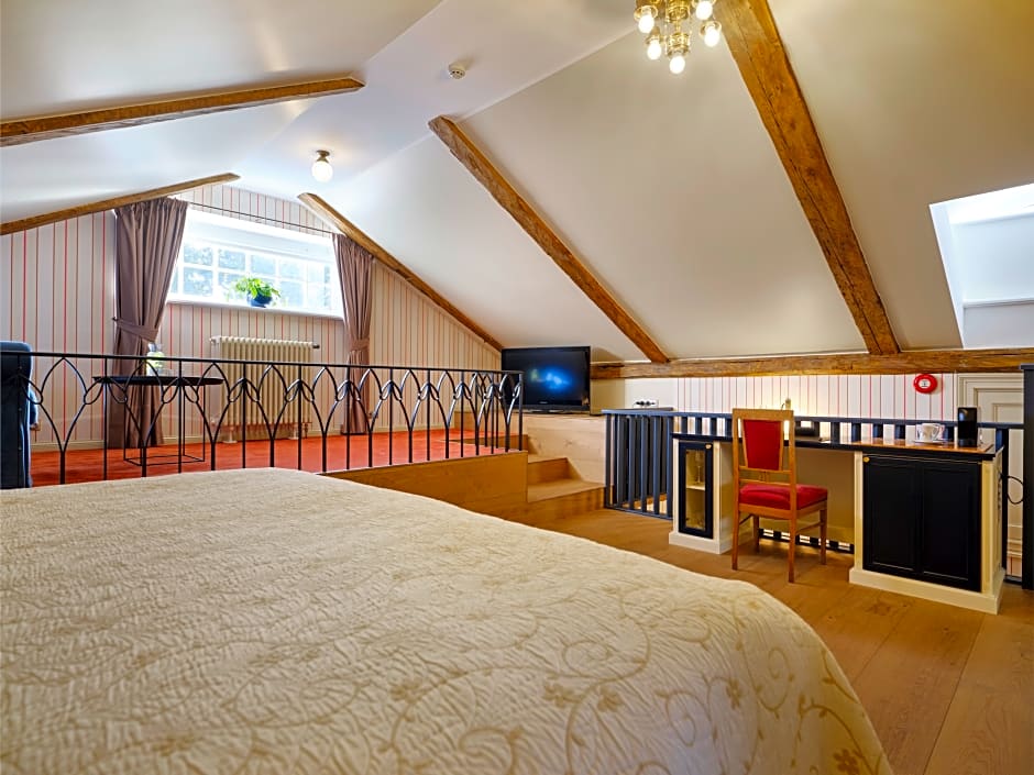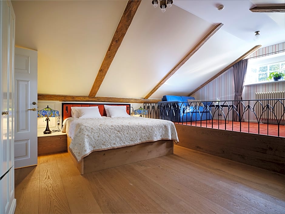 This mansard split-level room features a bathroom with a sauna. There is a seating area featured on the second level and a sofa-bed for children.