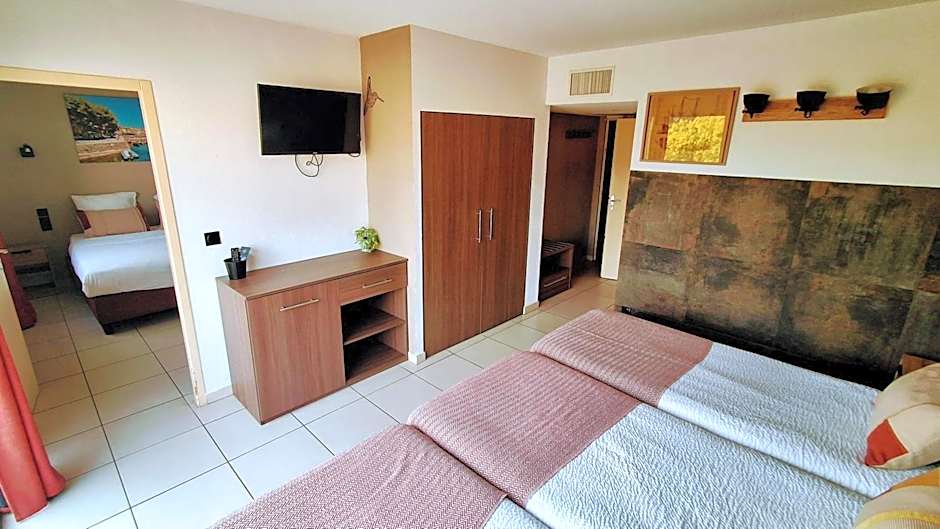 The family room provides air conditioning, a wardrobe, as well as a private bathroom featuring a shower and a hairdryer. Boasting a terrace, this family room also offers a carpeted floor and a flat-screen TV. The unit offers 3 beds.