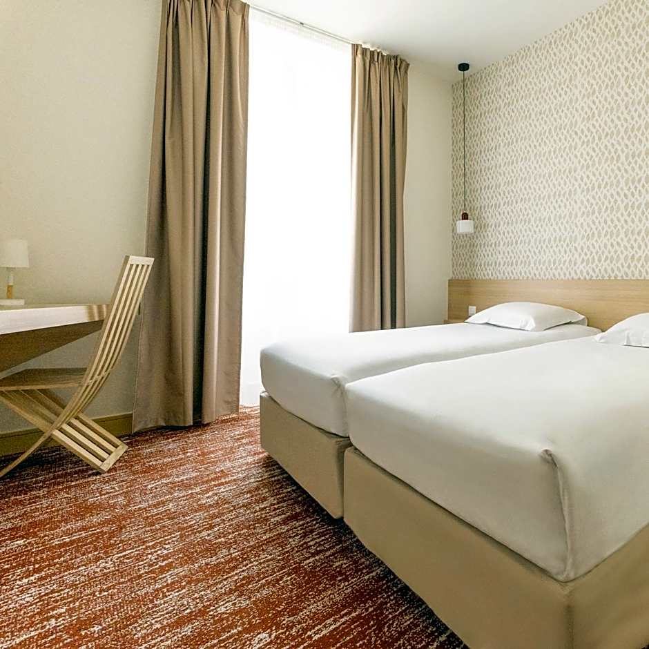 The Hotel Gambetta offers a variety of room types, including Single Rooms with City or Courtyard views, Twin Rooms with City or Courtyard views, Double Rooms with City or Courtyard views, and Two Adjacent Double Rooms. All rooms are non-smoking and accommodate either 1 adult or 2 adults with 1 child, except for the Two Adjacent Double Rooms which accommodate 4 adults and 3 children. The room sizes range from 118 sqft to 280 sqft and the bed options include Twin beds and Double beds.