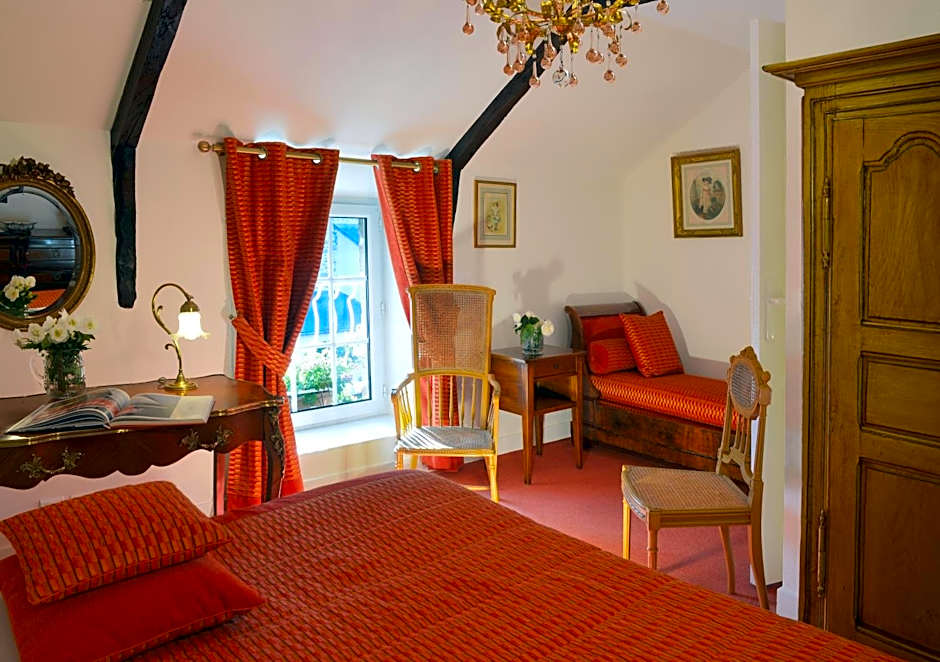 The room offers views of the French garden and a flat-screen TV. It also features original, wooden furniture.