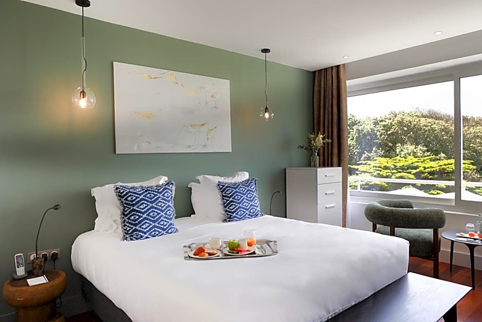 Facing the ocean and nestled in the heart of our green garden, these 27m2 rooms offer a spectacular view of the horizon. They have a king size bed (double or twin), a walk-in shower open to the bedroom and a contemporary living room with large bay windows.