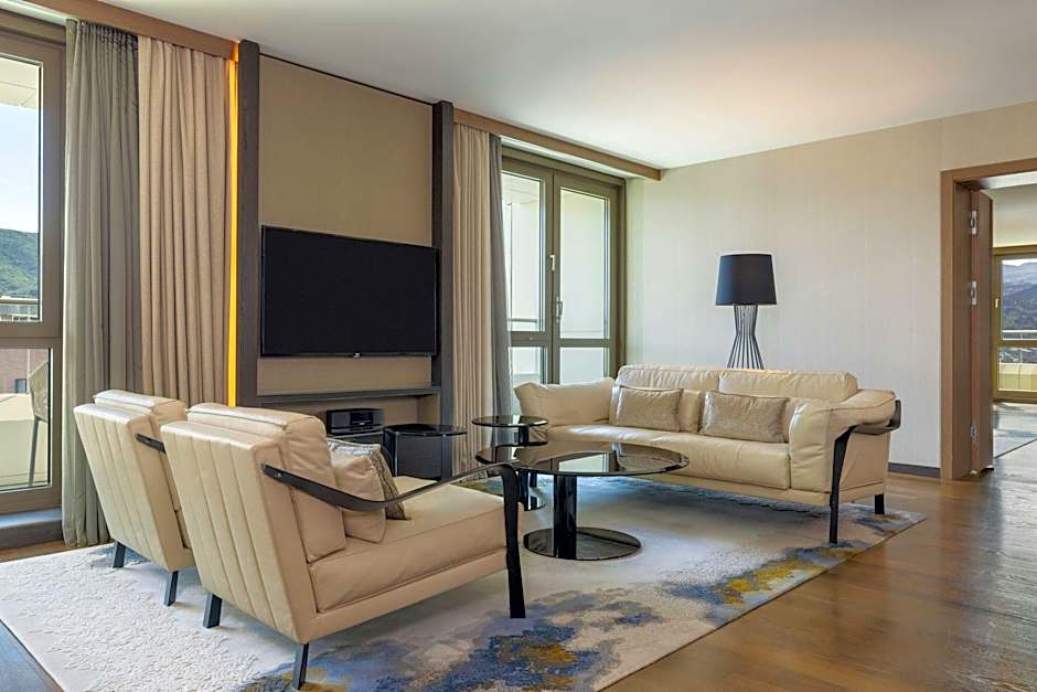 This very spacious suite comes with a bedroom and a living room area, an extensive bathroom with a bathtub and complimentary access to Club Lounge, with all-day snacks and drinks. The room features a flat-screen TV, room control touch panel, tea/coffee maker and air conditioning.