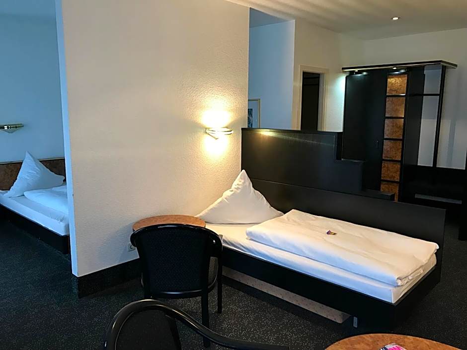 Hotel Bitterfelder Hof - Mongoo GmbH offers various types of rooms. The Business Twin Room accommodates 2 adults and 1 child with 2 twin beds. The Junior Suite is a spacious room with a queen-size bed that accommodates 2 adults. The Business Double Room has a king-size bed and accommodates 2 adults and 1 child. The Standard Triple Room is suitable for 3 adults and has a twin bed and a double bed. The Business Single Room is for 1 adult and has a twin bed. All rooms are non-smoking.