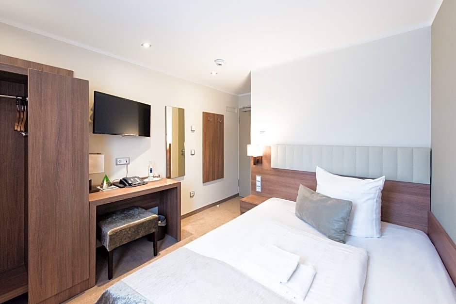 Double Room Comfort is 172 square feet and includes either a king-size bed 150-183 width or 2 single beds 80-130 width plus desk, satellite tv , and hairdryer.