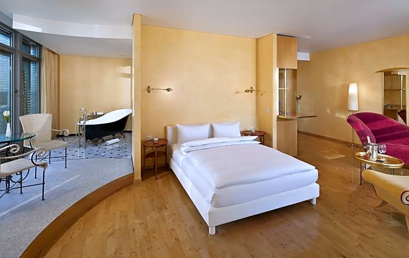 Decorated with modern-style furnishings, this air-conditioned suite features a small kitchenette with microwave as well as a large round bathtub with bathrobes and slippers. This suite also offers a view of the Frankfurt skyline.