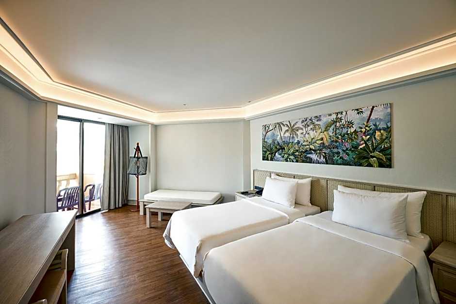 Room choices span several styles: Standard Room accommodates 4 adults and 3 children with a Queen-size bed, while Deluxe offers similar capacity and bed arrangements. A Family room adds a Sofa Bed for flexible sleeping, and other options include Lodge, Quadruple Room with Sea View, Economy Double Room, and a Double Room for single use.