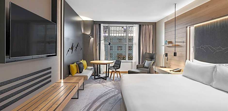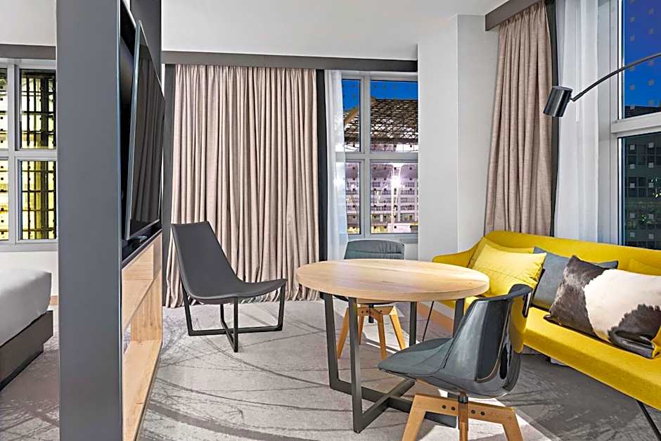 This room is located between the 4th - 6th floor and features a bed (180 x 79 in) and a view over the airport area through floor to ceiling windows. There are also blackout curtains, mini fridge for storage, a flat screen TV with international channels, a private bathroom including a walk-in shower. Guests booking this room category enjoy access to the executive lounge.