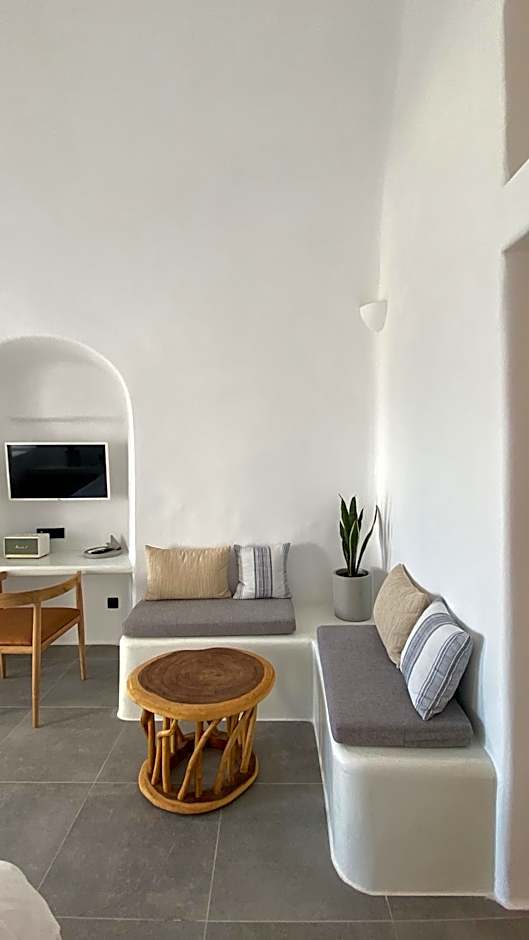 This suite consists of one bedroom with double bed, living room and balcony overlooking the Aegean Sea, the volcano and the romantic sunset. The elegant decoration is ideal for honeymooners.
